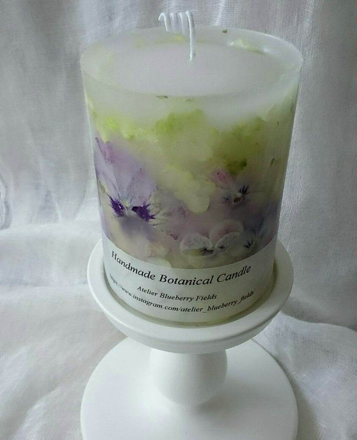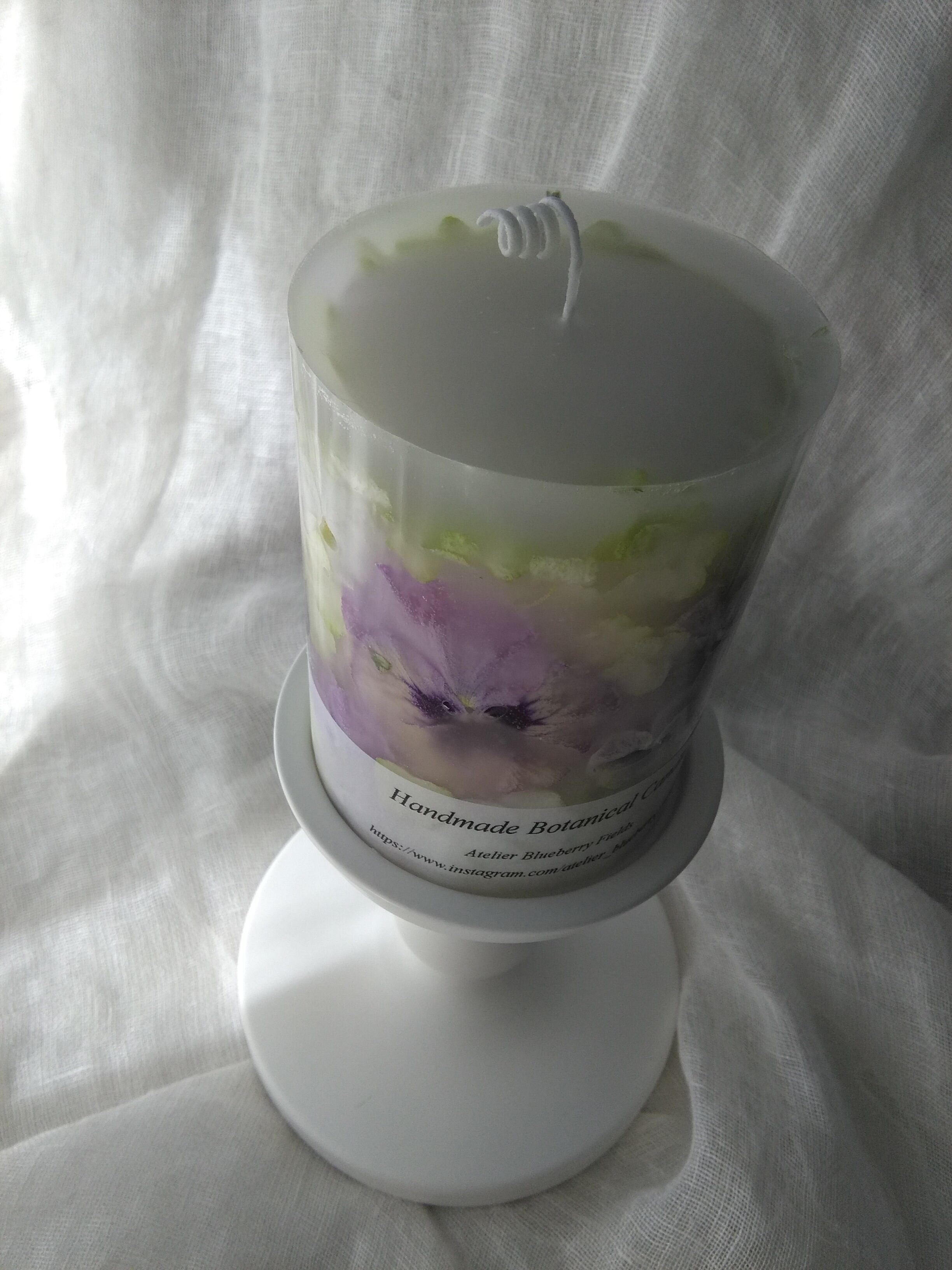 こちらのキャンドルには、パンジー、アジサイ、ビオラをたっぷりと詰め込んで、燃焼部分は空気を浄化してくれるソイキャンドルとなっております。